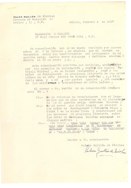[Carta] 1957 feb. 4, México [a] Madeleine S. Redditt, New York [manuscrito] Palma Guillén de Nicolau.
