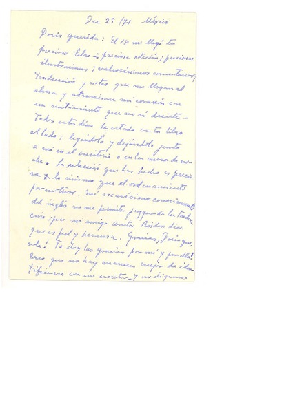 [Tarjeta], 1971 dic. 25, México [a] Doris Dana, [New York] [manuscrito] Palma Guillén de Nicolau.
