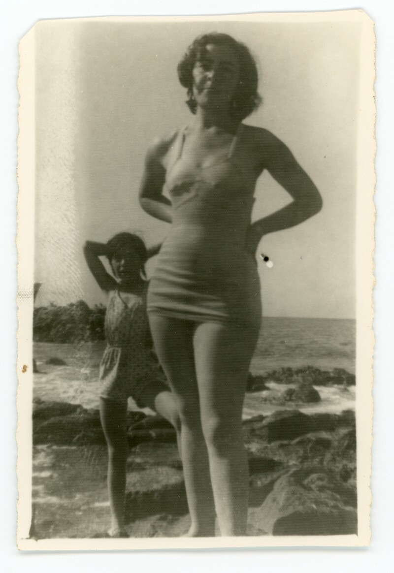 [Mujer y niña posando de pie, vestidas con traje de baño en la playa] [Fotografía].
