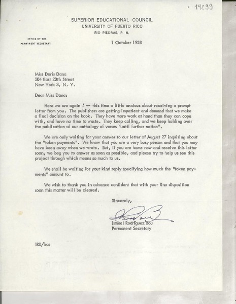 [Carta] 1958 Oct. 1, [Rio Piedras, Puerto Rico] [a] Miss Doris Dana, New York, N. Y. [manuscrito] Ismael Rodríguez Bou.