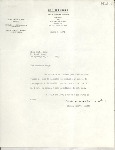 [Carta] 1971 ene. 4, San Juan, Puerto Rico [a] Miss Doris Dana, Hildreth Lane, Bridgehampton, N. Y. [manuscrito] Nilita Vientós Gastón.