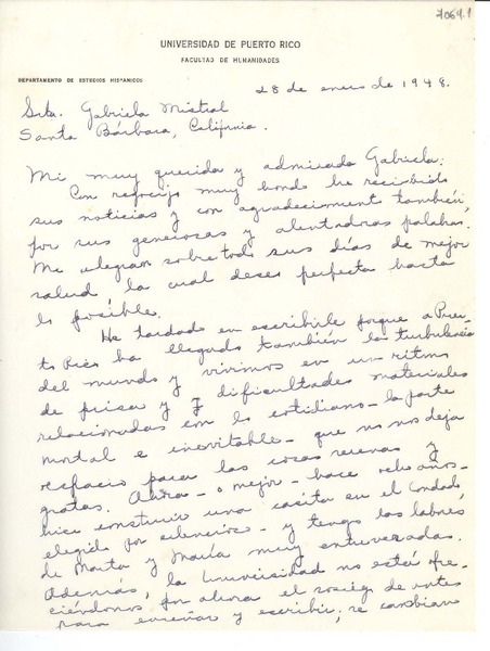 [Carta] 1948 ene. 28, Puerto Rico [a] Gabriela Mistral, Santa Bárbara, California [manuscrito] Conchita Meléndez.