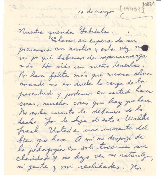 [Carta] [1943] mar. 10 [a] Gabriela Mistral [manuscrito] Inés Mendoza.