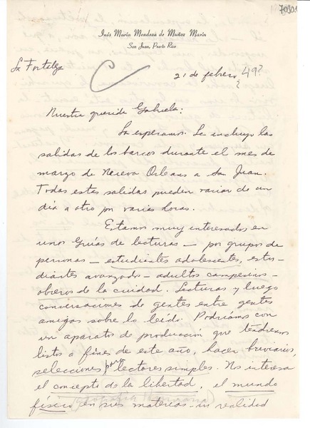 [Carta] [1949] feb. 21, San Juan, Puerto Rico [a] Gabriela Mistral [manuscrito] Inés María Mendoza de Muñoz Marín.