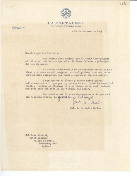 [Carta] 1949 feb. 16, San Juan, Puerto Rico [a] Gabriela Mistral, Veracruz, México [manuscrito] Inés M. de Muñoz Marín.