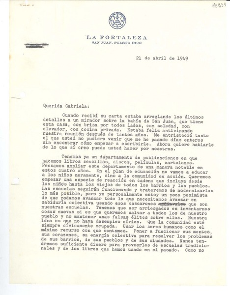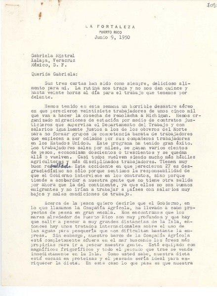 [Carta] 1949 ene. 25, Puerto Rico [a] Gabriela Mistral, Mérida, Yucatán, Méjico [manuscrito] Luis Muñoz Marín.