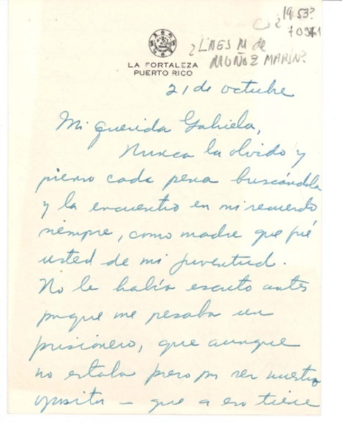 [Carta] [1953] oct. 21, Puerto Rico [a] Gabriela Mistral [manuscrito] Inés María Mendoza.