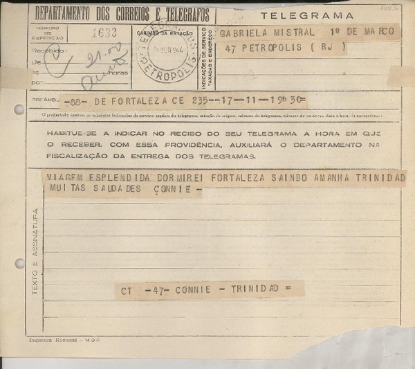 Telegrama 1944 jun. 11, Fortaleza C E, [Brasil] [a] Gabriela Mistral, Petrópolis, R J, [Brasil] [manuscrito] [Consuelo Saleva].