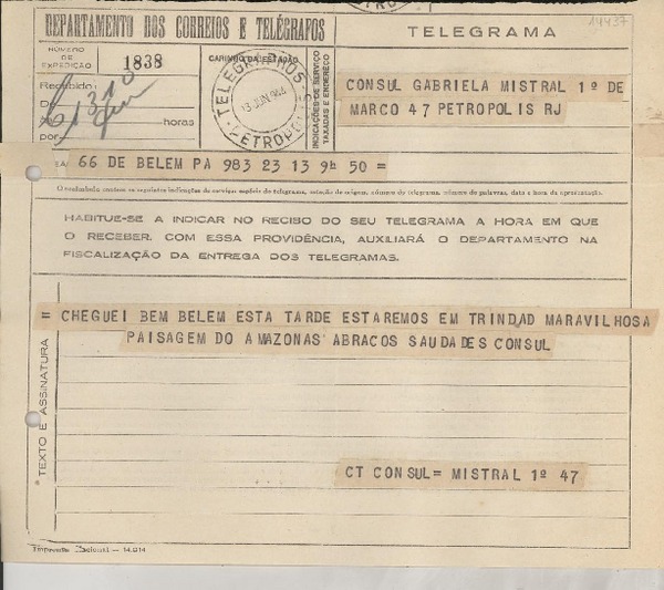 Telegrama 1944 jun. 13, Belem PA, [Brasil] [a la] Cónsul Gabriela Mistral, Petrópolis, R J, [Brasil] [manuscrito] [Consuelo Saleva].