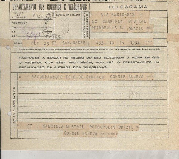 Telegrama 1944 jun. 14, Piedras, Puerto Rico [a] Gabriela Listral [i.e. Mistral], Consulado Chile, Petrópolis, R J, [Brasil] [manuscrito] [Consuelo] Saleva.