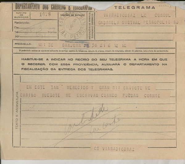 Telegrama 1944 jun. 1, Rio [de Janeiro], [Brasil] [a] Gabriela Mistral, Petrópolis, R J, [Brasil] [manuscrito] [Consuelo Saleva].