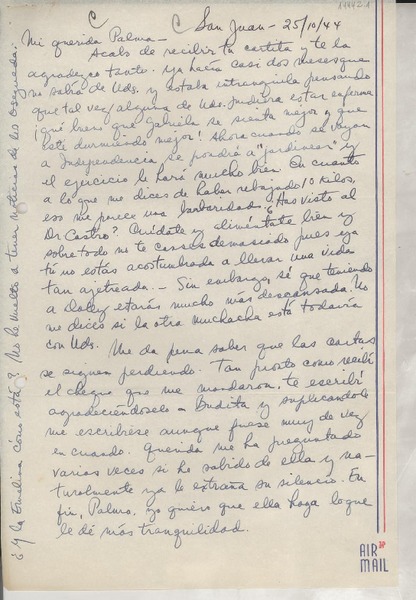 [Carta] 1944 oct. 25, San Juan, [Puerto Rico] [a] Mi querida Palma [Guillén] [manuscrito] [Consuelo Saleva].