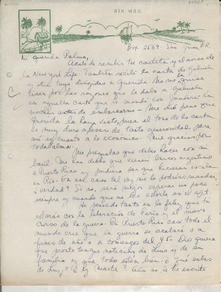 [Carta] [1944] , Box 2569, San Juan, Puerto Rico [a] Mi querida Palma [Guillén] [manuscrito] [Consuelo Saleva].