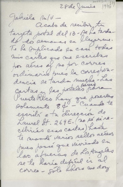 [Carta] 1947 jun. 20, Santurce, [Puerto Rico] [a] Gabriela Mistral [manuscrito] Concha Meléndez.