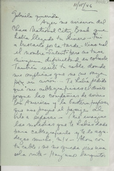 [Carta] 1946 nov. 15 [a] Gabriela [Mistral] [manuscrito] [Consuelo Saleva].