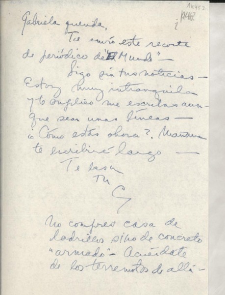 [Carta] [1946?] [a] Gabriela [Mistral] [manuscrito] [Consuelo Saleva].