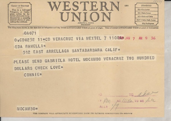 [Telegrama] 1949 ene. 7, Veracruz, [México] [a] Eda Ramelli, 512 East Arrellaga, Santa Barbara, Calif., [EE.UU.] [manuscrito] [Consuelo Saleva].