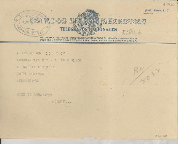 [Telegrama] 1949 abr. 6, San Juan, [Puerto Rico] [a] Gabriela Mistral, Hotel Mocambo, Veracruz, [México] [manuscrito] [Consuelo Saleva].