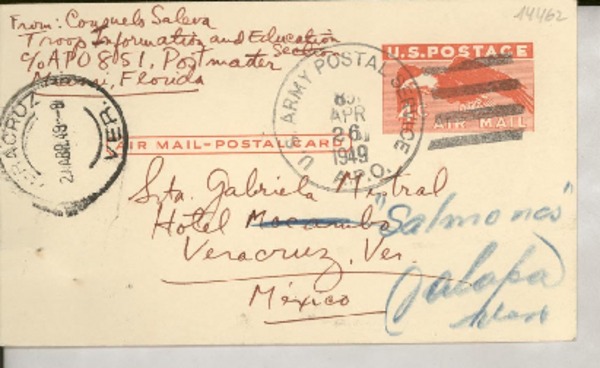 [Tarjeta postal] 1949 abr. 26, Troop Information and Education Section, co APO 851, Post mater, Miami Florida [a la] Srta. Gabriela Mistral, Hotel "Salmones", Jalapa, Veracruz, Ver., México [manuscrito] / Consuelo Saleva.