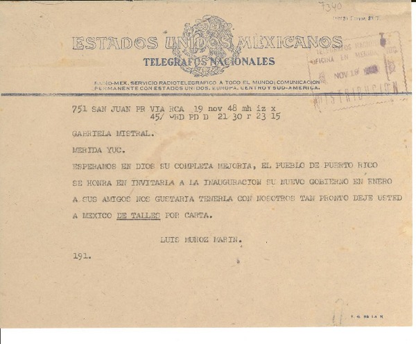 [Telegrama] 1948 nov. 19, San Juan, Puerto Rico [a] Gabriela Mistral, Mérida, Yuc[atán], [México] [manuscrito] Luis Muñoz Marín.