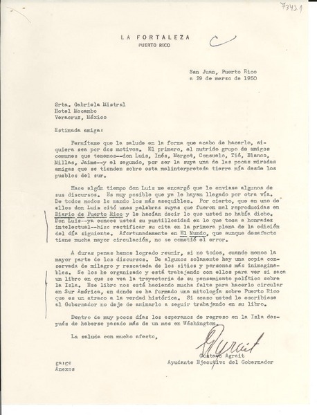 [Carta] 1950 mar. 29, San Juan, Puerto Rico [a] Gabriela Mistral, Veracruz, México [manuscrito] Gustavo Agrait.