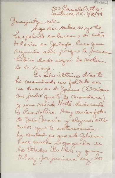 [Carta] 1949 oct. 3, 303 Canals (altos), Santurce, [Puerto Rico] [a la] Guagüita [manuscrito] [Consuelo Saleva].