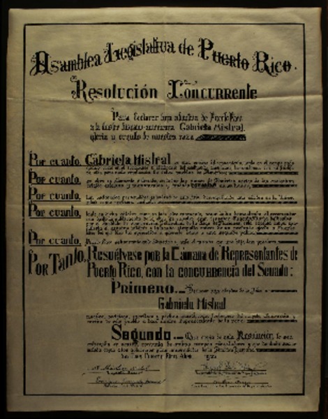 [Diploma] 1933 abr., San Juan, Puerto Rico [a] Gabriela Mistral [manuscrito] Asamblea Legislativa de Puerto Rico.