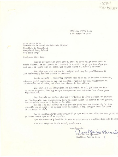 [Carta] 1957 ene. 8, Hatillo, Puerto Rico [a] Doris Dana, Secretaria personal de Gabriela Mistral, Hospital de Hempstead, New York, [Estados Unidos]. [manuscrito] Ana Marina Mercader.