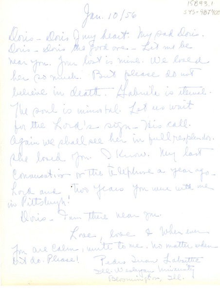[Carta] 1956? ene. 10, Ill. Wesleyan University, [Illinois, Estados Unidos] [a] Doris Dana. [manuscrito] Pedro Juan Labarthe