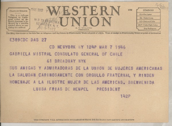 [Telegrama] 1946 mar. 7, New York, [EE.UU.] [a] Gabriela Mistral, Consulato General of Chile, 61 Broadway, NYK, [EE.UU.] [manuscrito] Luisa Frias de Hempel, President.