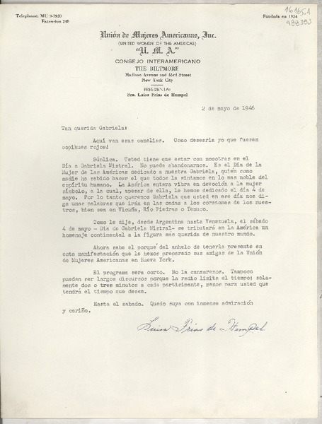 [Carta] 1946 abr. 17, The Biltmore, Madison Avenue at 43rd Street, New York 17, N. Y., [EE.UU.] [a la] Señorita Gabriela Mistral, Consulado General de Chile, San Francisco, California, [EE.UU.] [manuscrito] Luisa Frías de Hempel, Presidenta de la Unión de Mujeres Americanas.