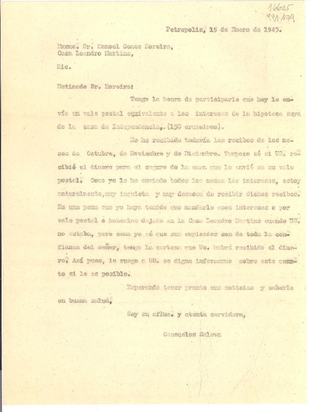 [Carta] 1945 ene. 15, Petrópolis, [Brasil] [al] Excmo. Sr. Manoel Gomes Moreira, Casa Leandro Martino, Rio, [Brasil] [manuscrito] Consuelo Saleva.
