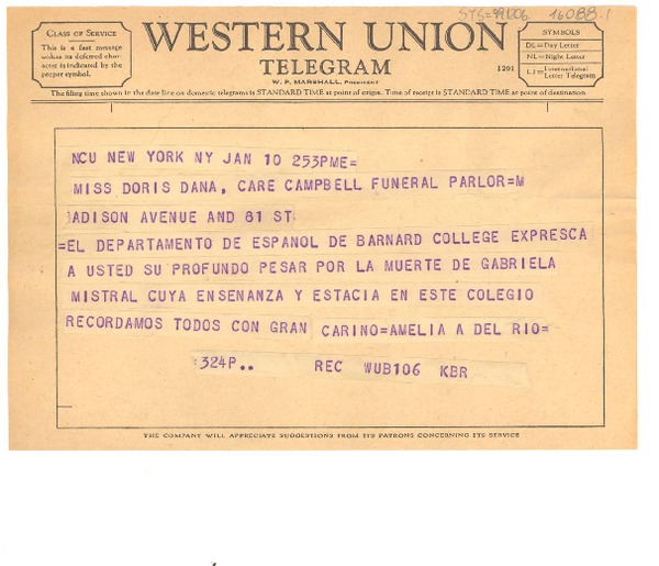[Telegrama] 1957 jan. 10, New York, [Estados Unidos] [a] Doris Dana, New York, [Estados Unidos] [manuscrito] Amelia A. del Río.