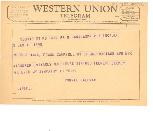 [Telegrama] 1957 jan. 10, San Juan, Puerto Rico [a] Doris Dana, New York, [Estados Unidos] [manuscrito] Connie Saleva.