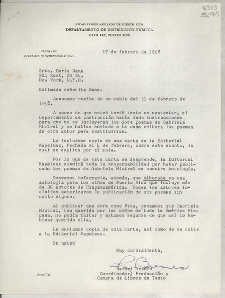 [Carta] 1958 ene. 20, Hato Rey, Puerto Rico [a la] Srta. Doris Dana, 15 Spruce Street, Roslyn Harbor, Long Island, New York, [EE.UU.] [manuscrito] Rafael Brenes, Especialista en Libros de Texto.