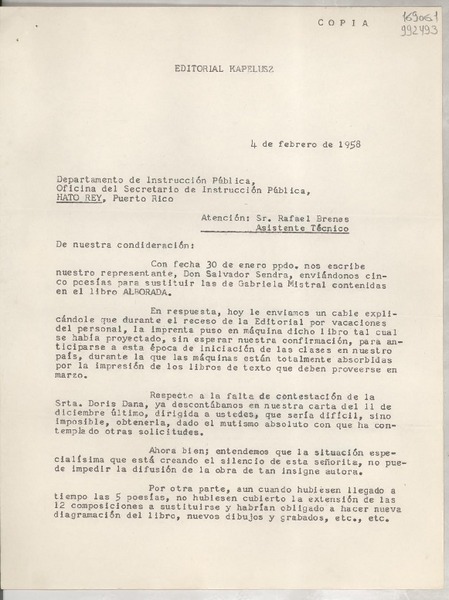[Carta] 1958 feb. 4, [Puerto Rico] [a] Rafael Brenes [manuscrito] Editorial Kapelusz.