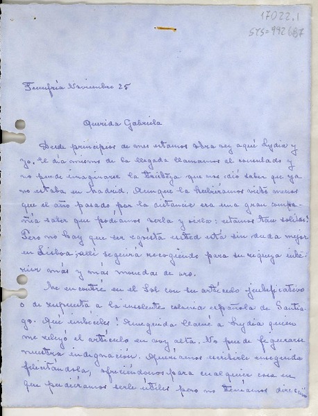 [Carta] 1933? nov. 25, Fuenfría, [España] [a] Gabriela [Mistral, Lisboa. Portugal] [manuscrito] Teresa [de la Parra].