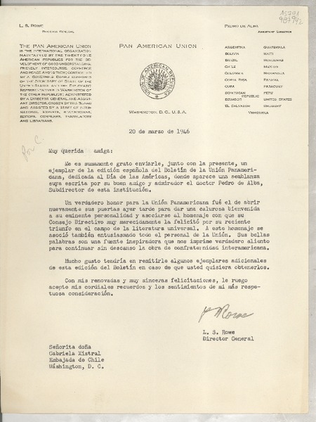 [Carta] 1946 mar. 20, Washington, D. C., U.S.A. [a la] Señorita doña Gabriela Mistral, Embajada de Chile, Washington, D. C., [EE.UU.] [manuscrito] L. S. Rowe, Director General.