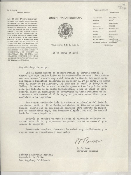 [Carta] 1946 abr. 16, Washington 6, D. C., E.U.A. [a la] Señorita Gabriela Mistral, Consulado de Chile, Los Angeles, California, [EE.UU.] [manuscrito] L. S. Rowe, Director General.