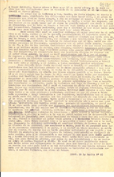 [Carta] 1943 jun. 19, Petrópolis, [Brasil] [a] Roger Caillois, Buenos Aires, [Argentina] [manuscrito] Gabriela Mistral.