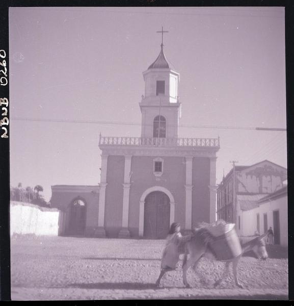 [Iglesia Santa Inés; niña y un burrito que lleva carga] [fotografía] Ignacio Hochhäusler.