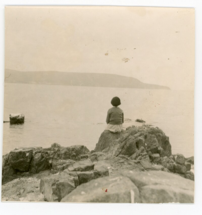 [Niña en roquerío de balneario de Pichilemu junto a un perro] [fotografía].