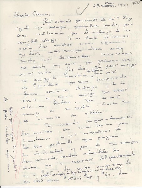 [Carta] 1951 feb. 28 [a] Gabriela [Mistral] [manuscrito] Eda [Ramelli].