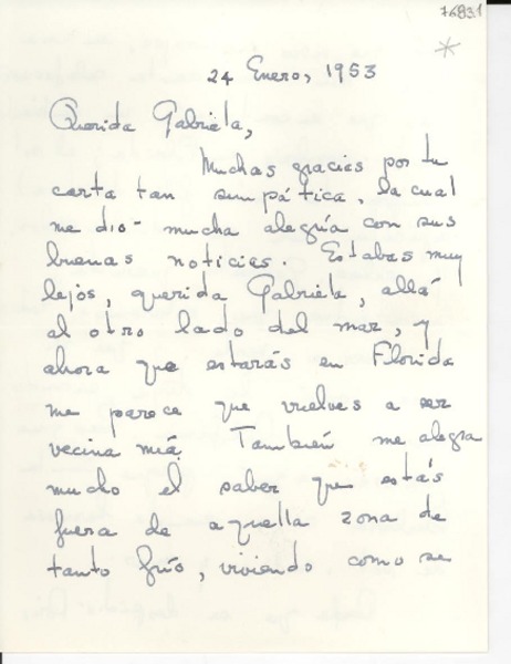 [Carta] 1953 ene. 24, [Estados Unidos] [a] Gabriela Mistral [manuscrito] Eda [Ramelli].