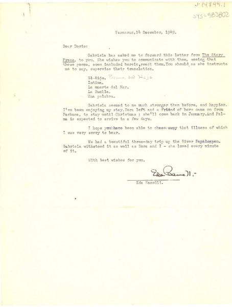 [Carta] 1949 dec. 14, Veracruz, [México] [a] Doris [Dana] [manuscrito] Eda Ramelli.