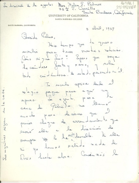 [Carta] 1957, [Santa Barbara, California, Estados Unidos] [a] Palma [Guillén] [manuscrito] Eda [Ramelli].