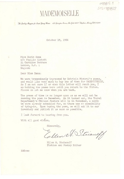[Carta] 1966 oct. 19, New York, [Estados Unidos] [a] Doris Dana, London, England [manuscrito] Ellen A. Stoianoff.