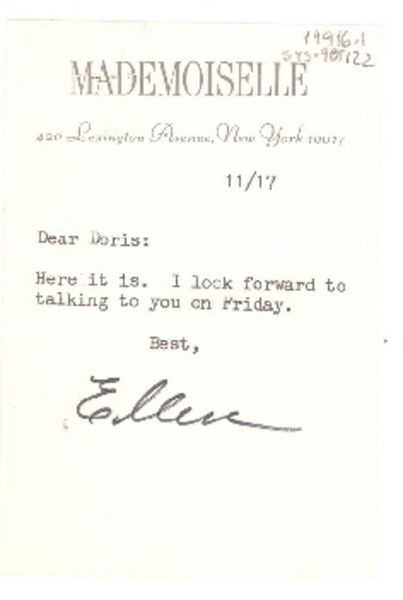 [Carta] [1970?] nov. 17, [New York, Estados Unidos] [a] Doris [Dana], [Estados Unidos] [manuscrito] Ellen [A. Stoianoff].