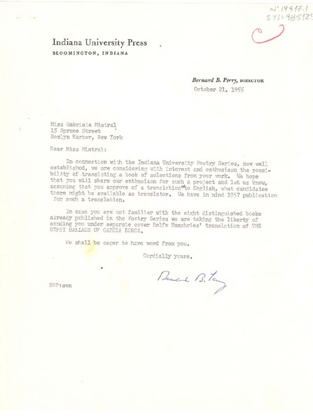 [Carta] 1955 oct. 21, [Bloomington, Indiana, Estados Unidos] [a] Gabriela Mistral, Roslyn Harbor, New York, [Estados Unidos] [manuscrito] Bernard B. Perry.