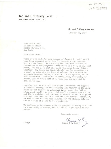 [Carta] 1956 jan. 19, Bloomington, Indiana, [Estados Unidos] [a] Doris Dana, Roslyn Harbor, New York, [Estados Unidos] [manuscrito] Bernard B. Perry.